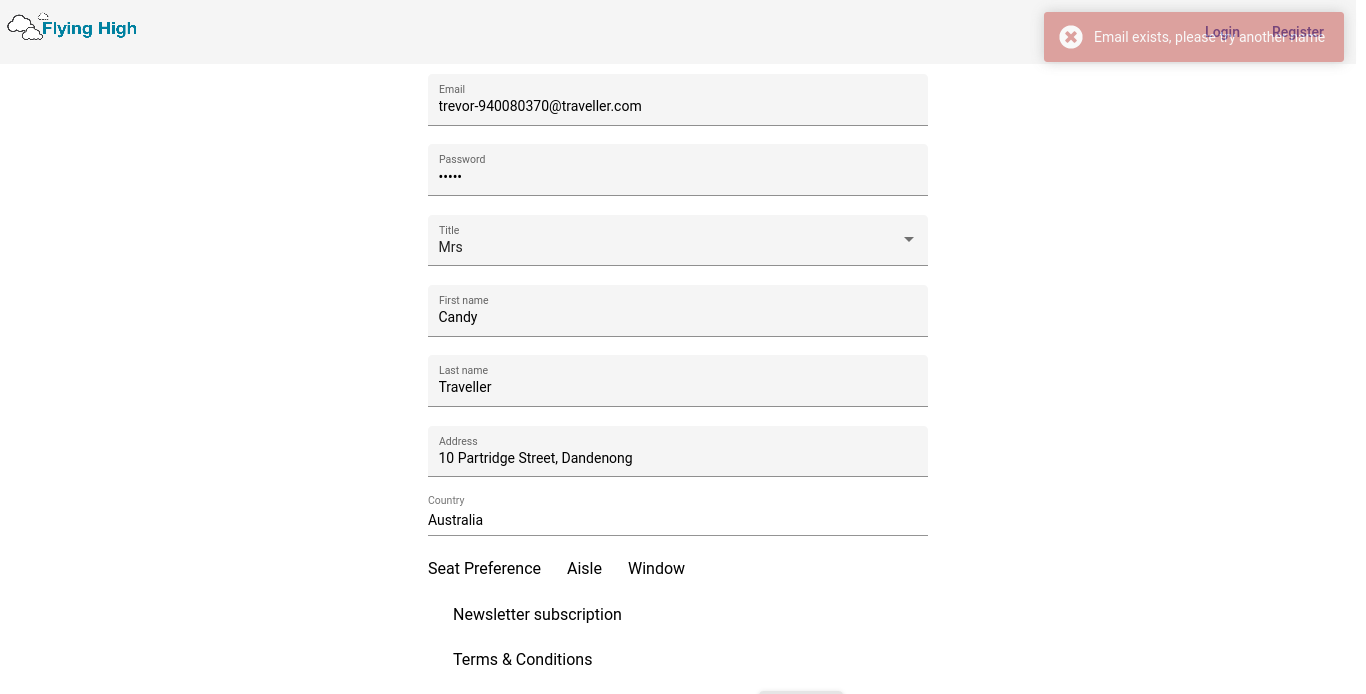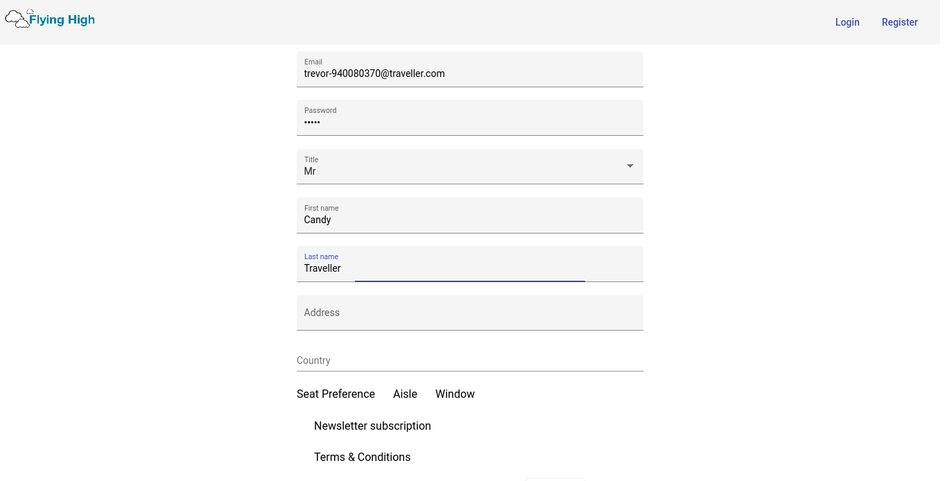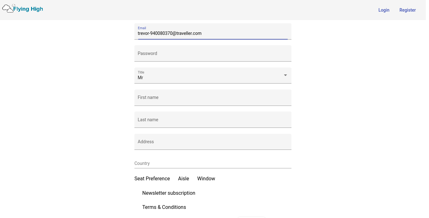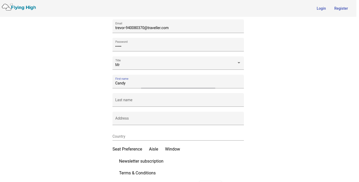 Candy registers for a new Frequent Flyer account with email trevor-940080370@traveller.com
