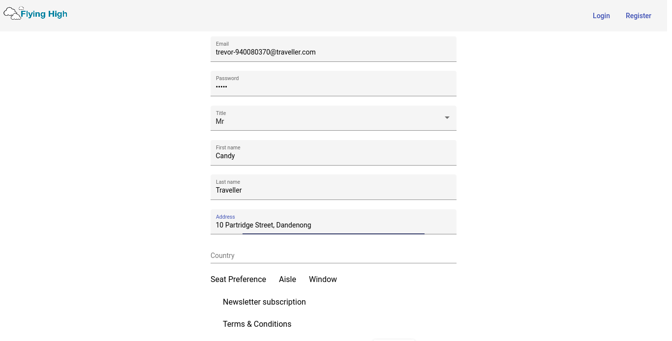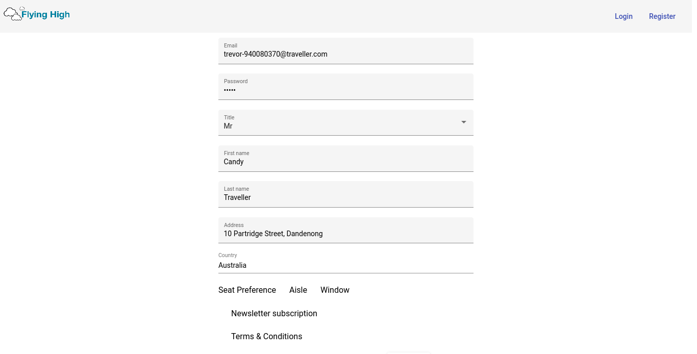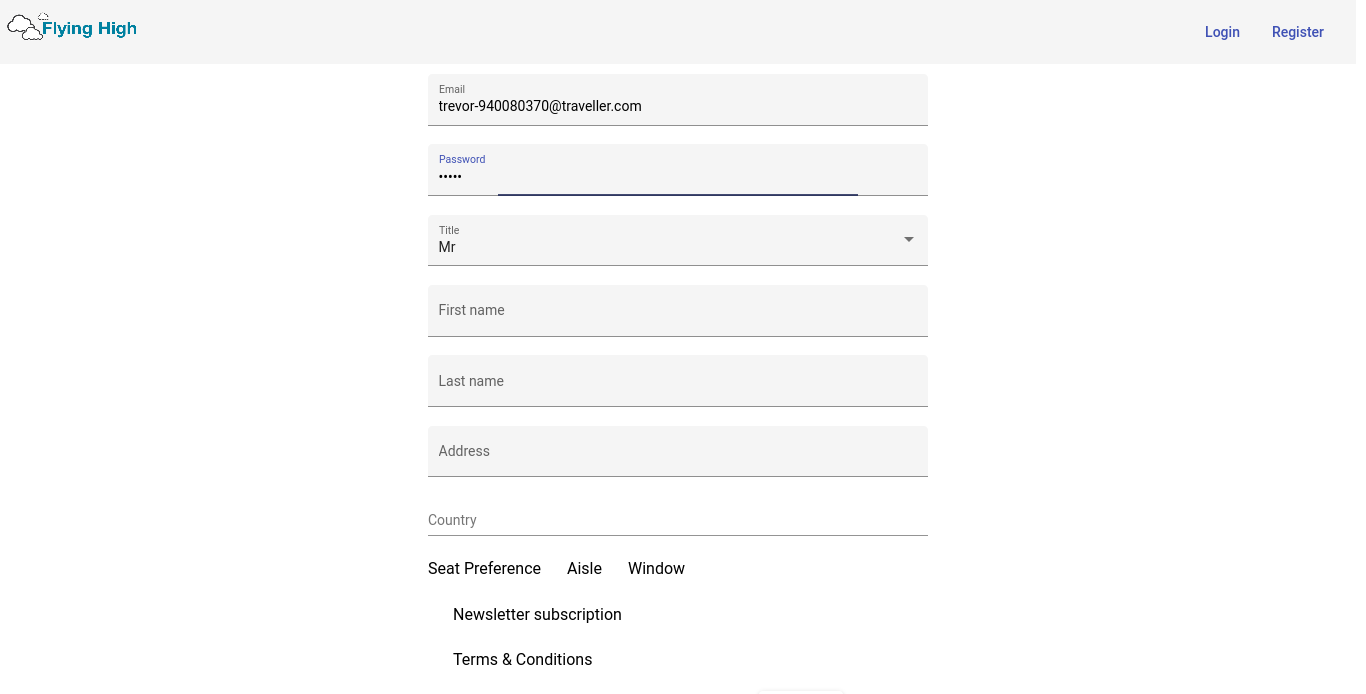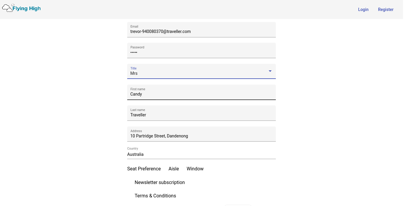 Candy registers for a new Frequent Flyer account with email trevor-940080370@traveller.com