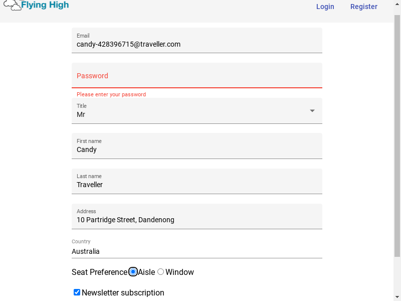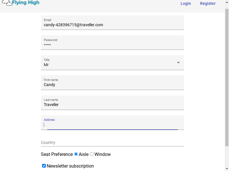 Candy registers for a new Frequent Flyer account with email candy-428396715@traveller.com