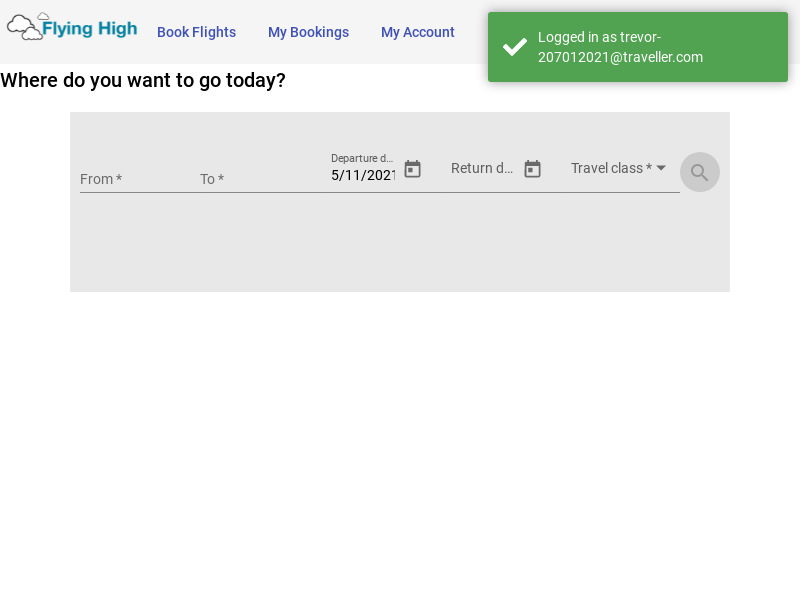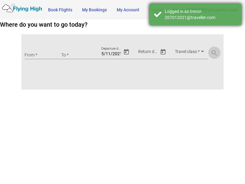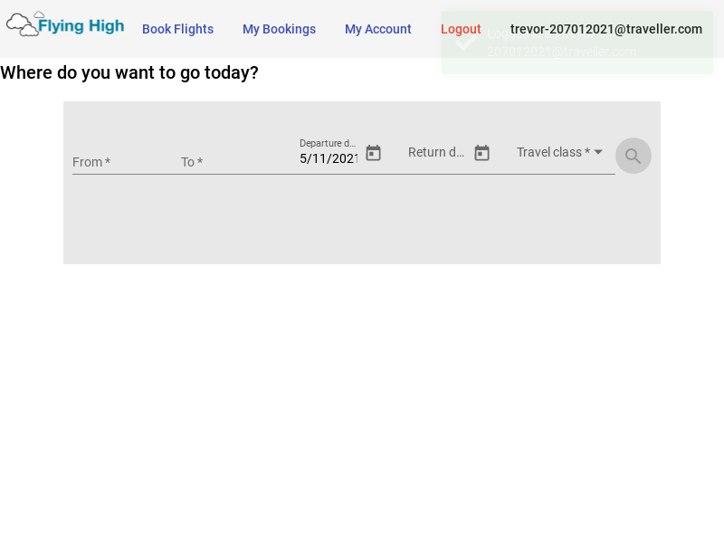 he expects to see a message of 'Logged in as trevor-207012021@traveller.com'