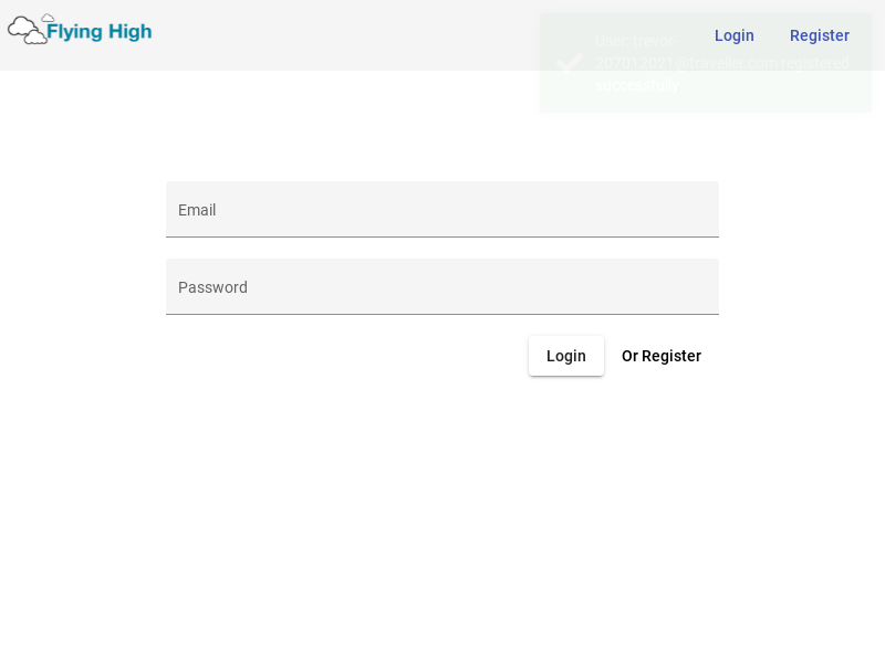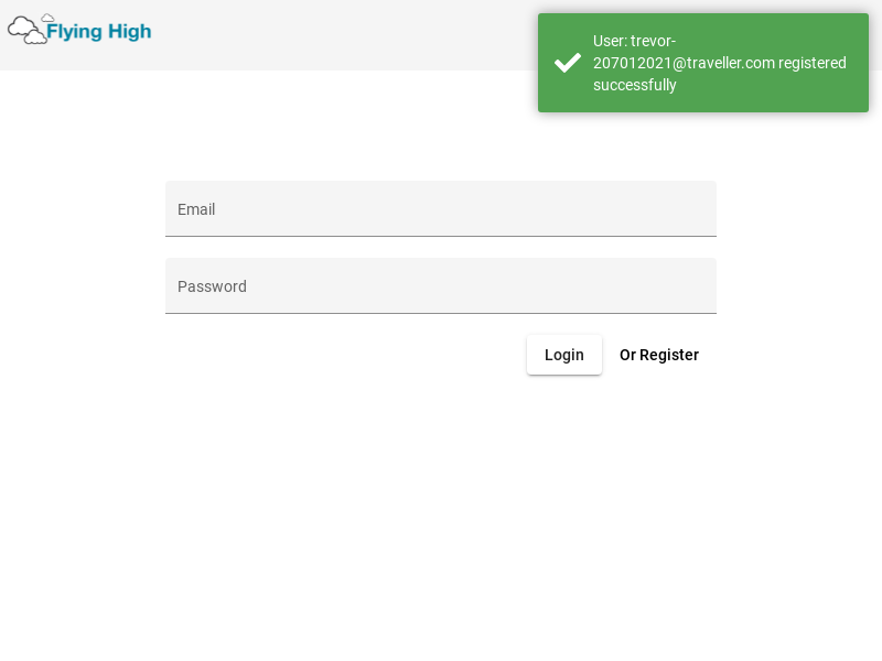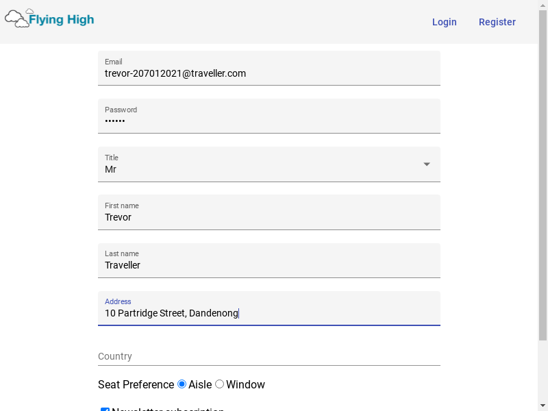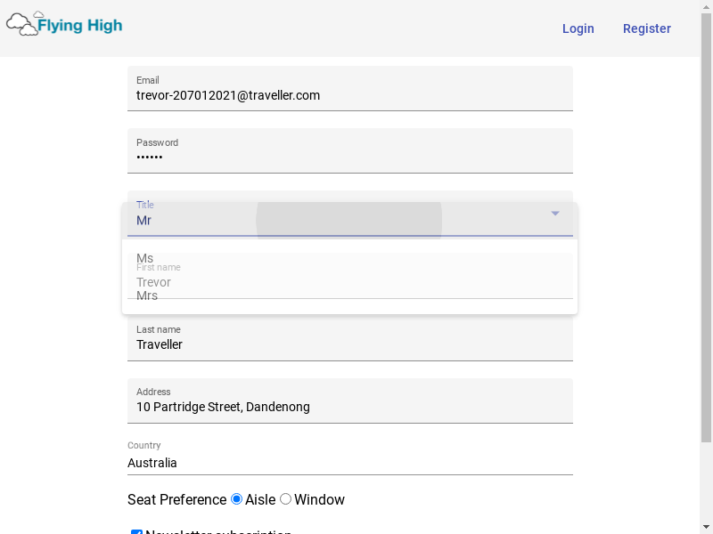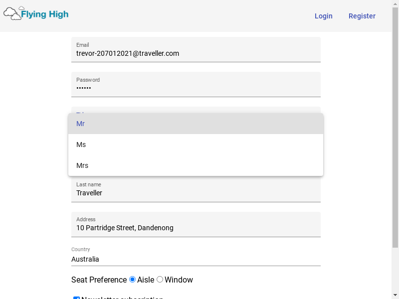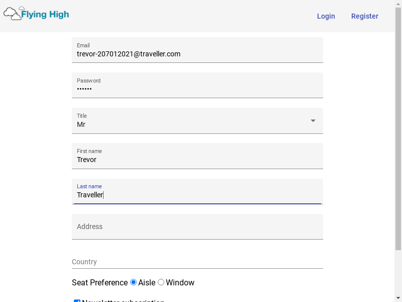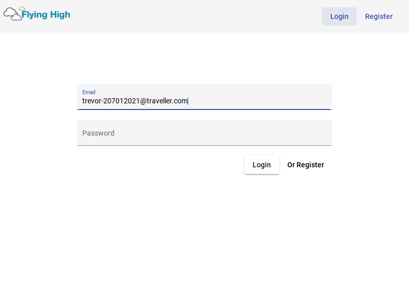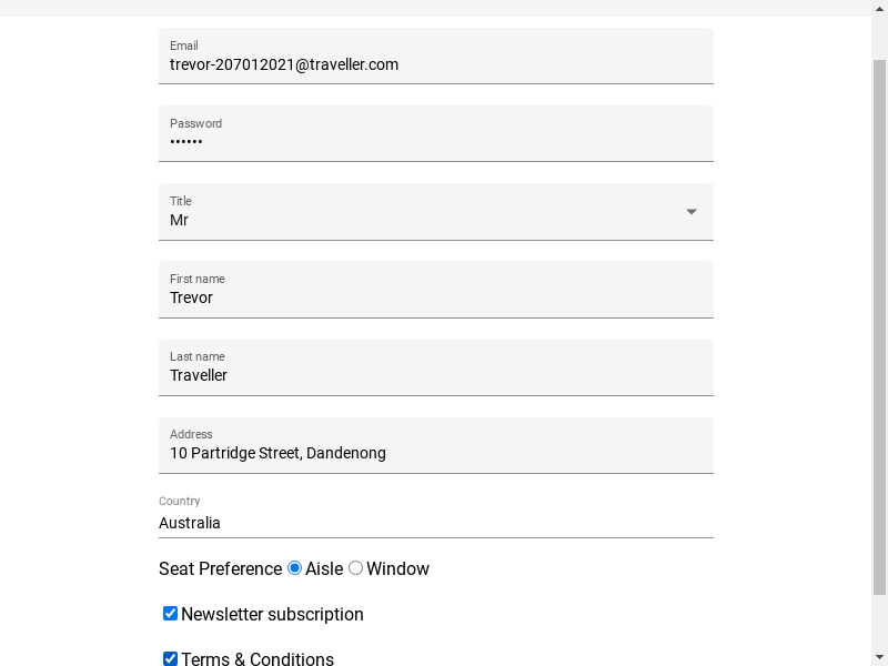 Trevor registers for a new Frequent Flyer account with email trevor-207012021@traveller.com