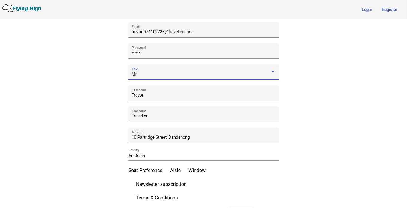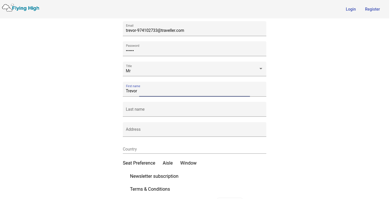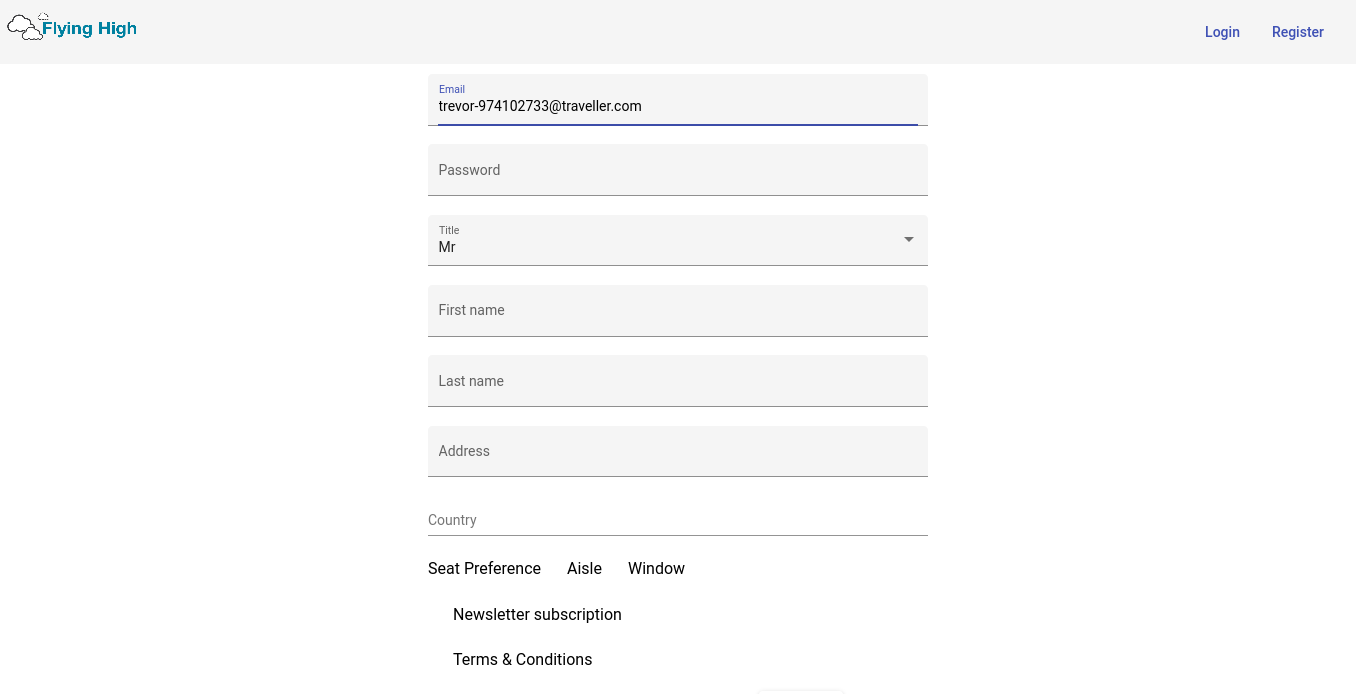 Trevor registers for a new Frequent Flyer account with email trevor-974102733@traveller.com