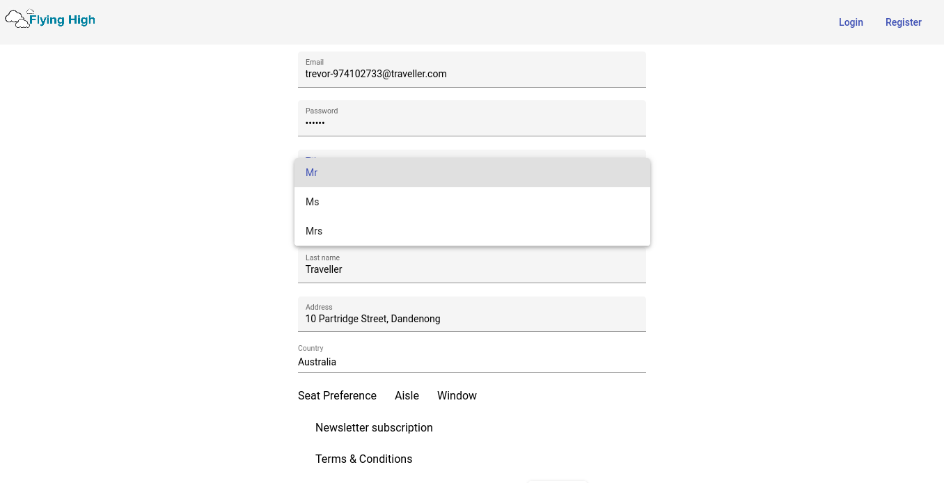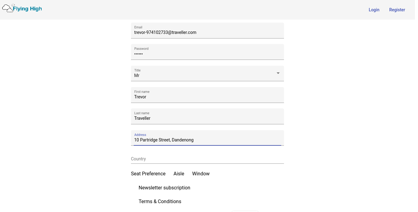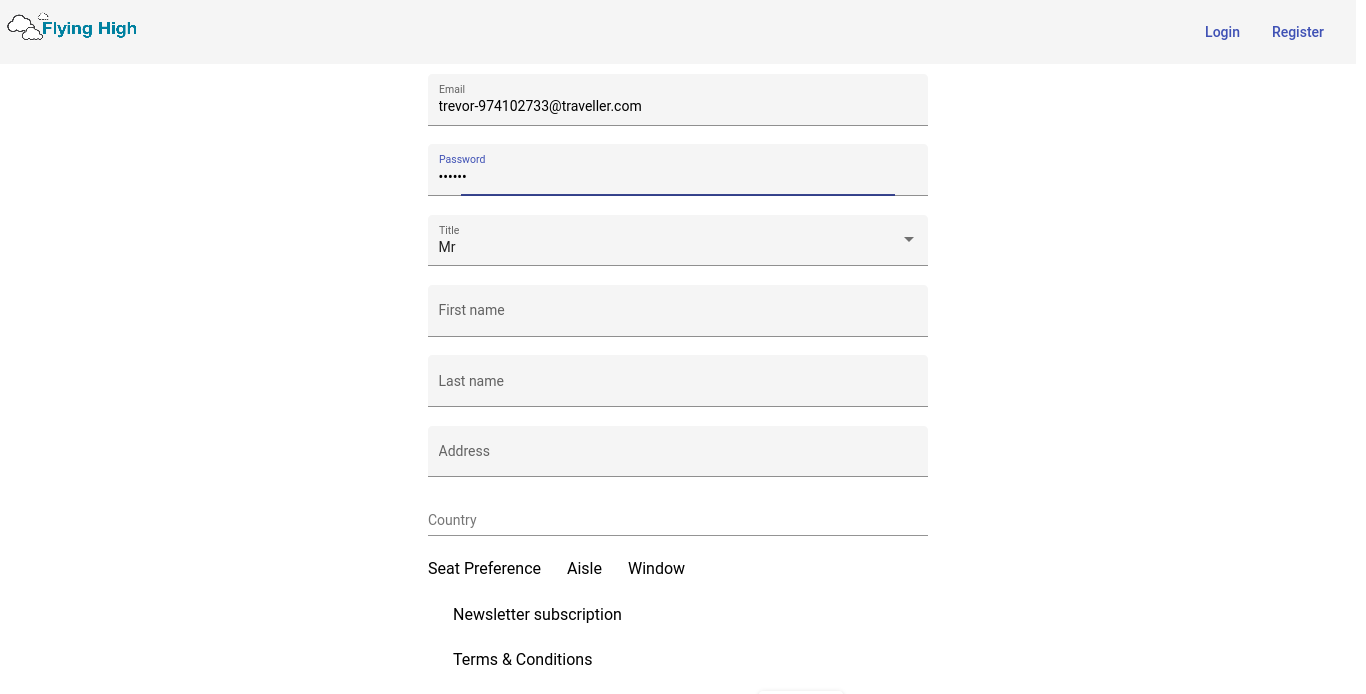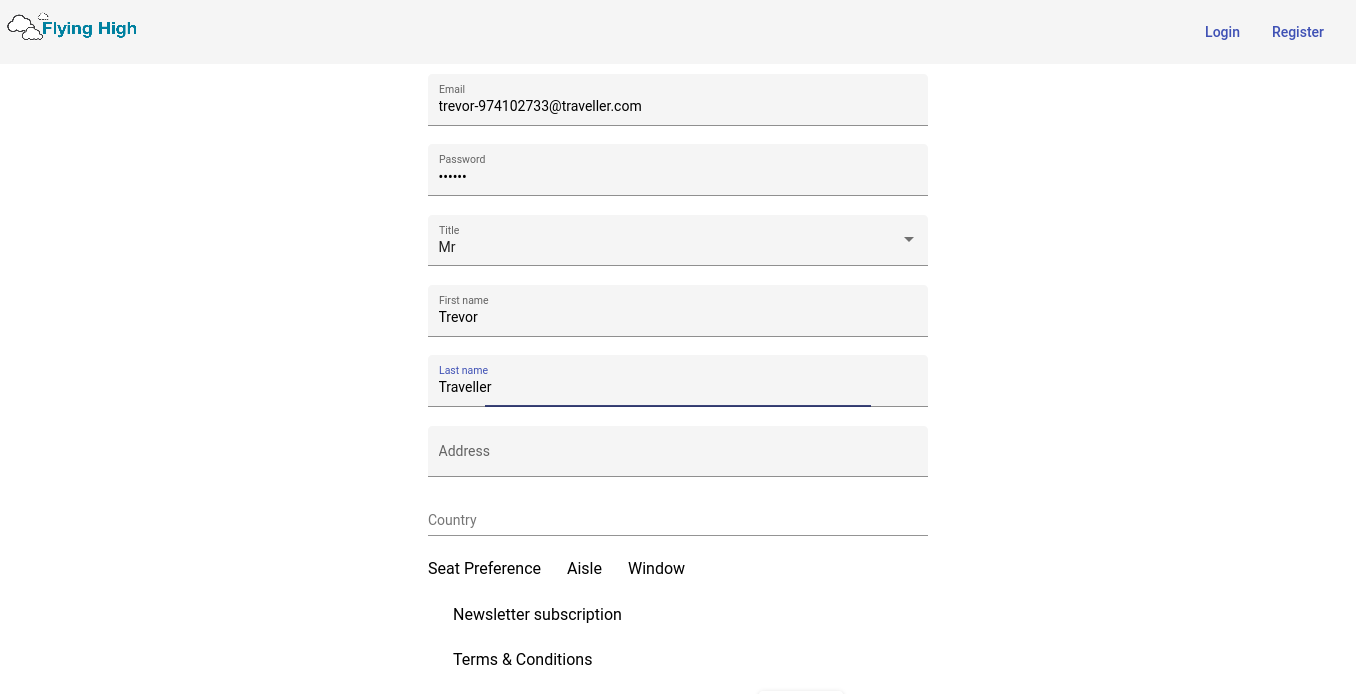 Trevor registers for a new Frequent Flyer account with email trevor-974102733@traveller.com